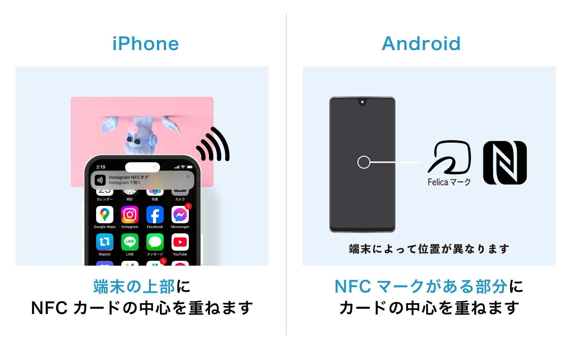 端末によっては「NFC非対応」の場合もございます。NFCだけでなく、裏面にQRコードを配置するなどの工夫がオススメです。